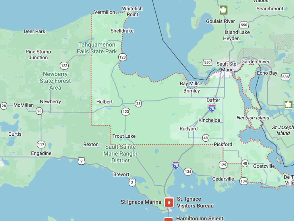Kincheloe, Saute Ste. Marie, Rudyard, Mackinac Island, Detour, Cedarville, St. Ignace, Brimley, Pickford.