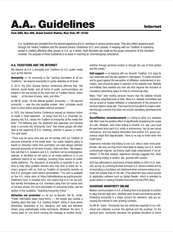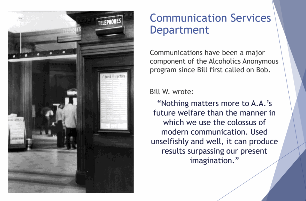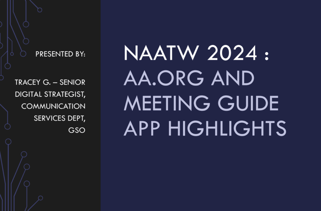 TECHNOLOGY COMMUNICATIONS COMMITTEE (TCC) Technology changes – A.A.s Principles don’t. We’re still one alcoholic sharing hope with another. WHAT WE DO AND WHY The National A.A. Technology WorkshopNAATW.ORG AA Guidelines on the InternetGuidelines on Email GSO Communications Services Department GSO Presentation on The Meeting Guide App